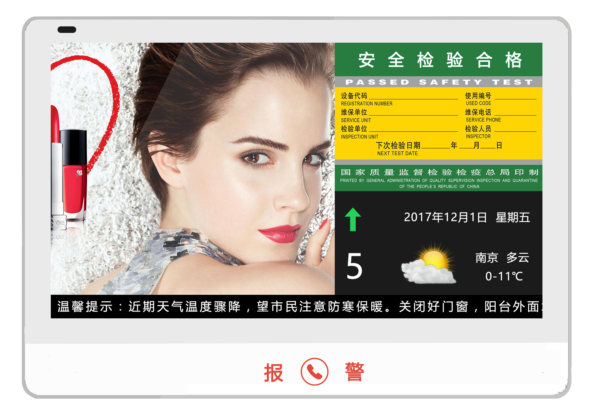 電梯內部安裝電梯分屏終端,搭載電梯安撫報警系統,完成電梯安全監控、緊急報警、安全信息發布以及商業傳媒廣告營銷的功能。