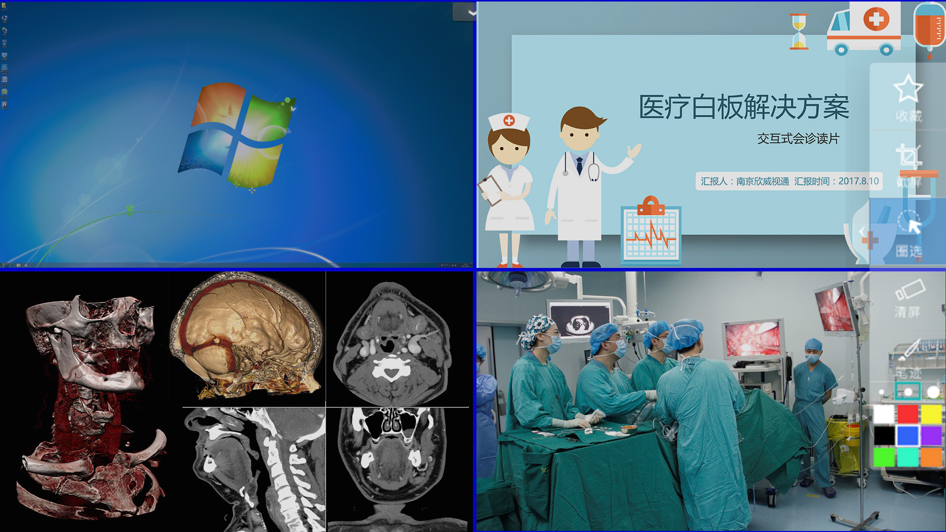 交互式醫療會診讀片-醫療白板用于患者的病情分析、手術過程直播、醫學會議等。其具備4K@120Hz標準分辨率輸出,灰階顯示符合DICOM顯示函數標準,可通過紅外觸摸實現交互式操作,對任意輸入圖像都可進行書寫批注功能。內置自動亮度校準,更是支持支持數字通道雙畫面PIP/PBP、4畫面PBP顯示功能,保證醫療會診的精準性。