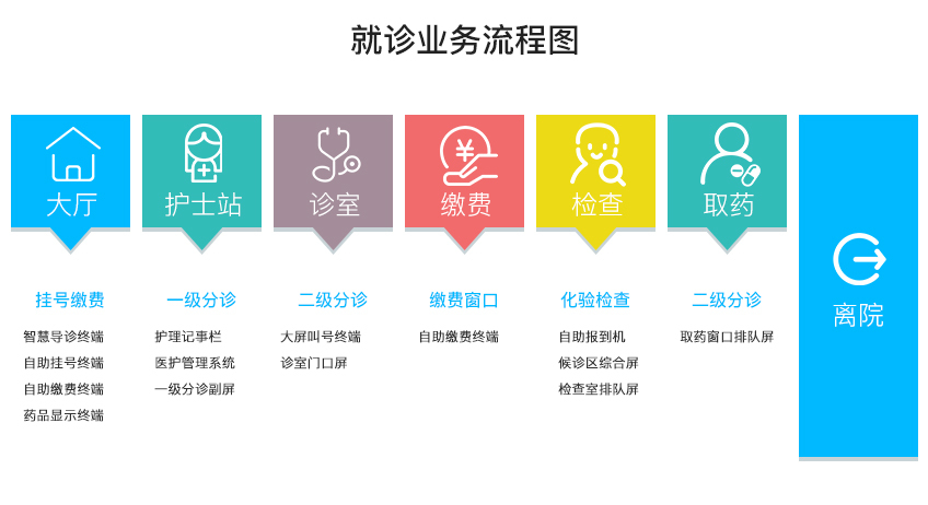 結合醫院就診流程和實際業務,對接醫院HIS系統,不同終端設備分布于醫院的各個區域,用于不同的功能顯示。